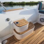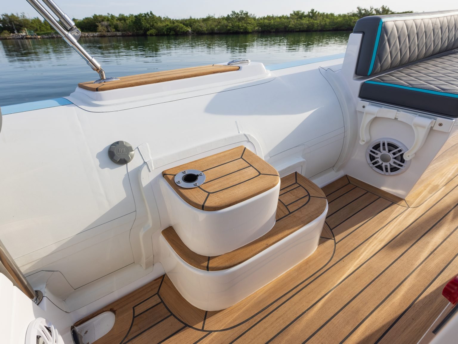 Yacht quality stainless steel hardware throughout: cleats, recessed railings, and cup holders